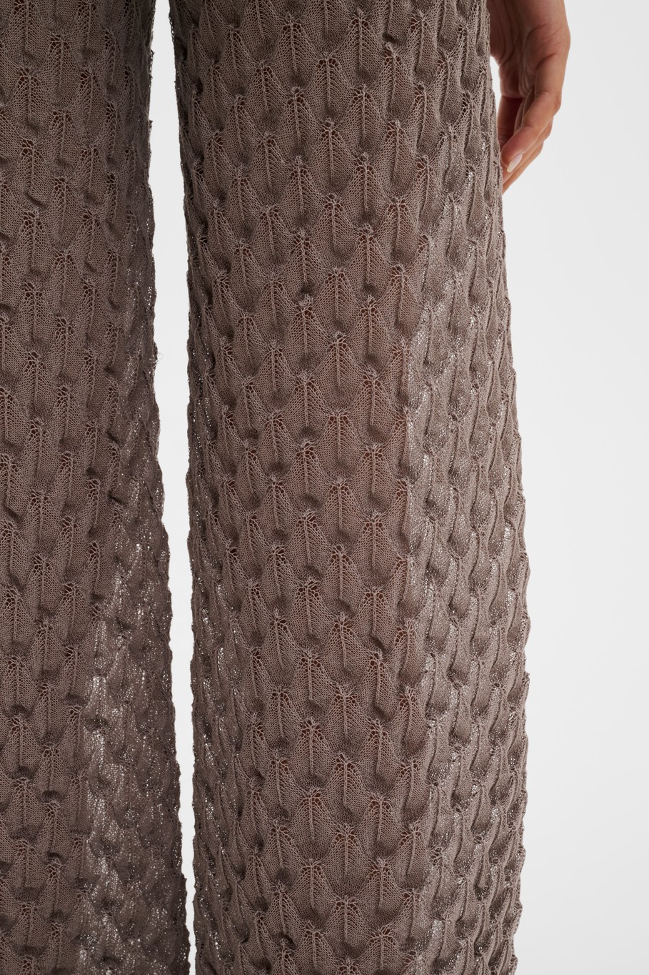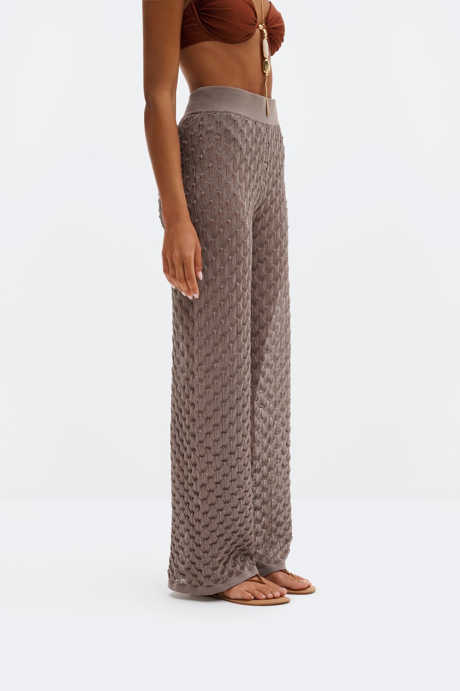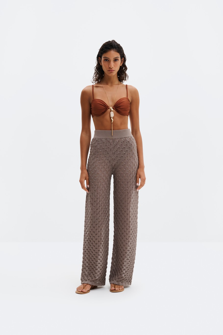 Kauniit viskoosi sekoitteesta valmistetut housut, jossa yksityiskohtana korkea vyötärö, joustava kuminauha sekä tyylikäs kohokuviointi. Housuissa suora. malli, joten suosittelemme valitsemaan oman koon. Yhdistä settinä Moa knitted paidan kanssa tai lempi neuleesi kanssa.