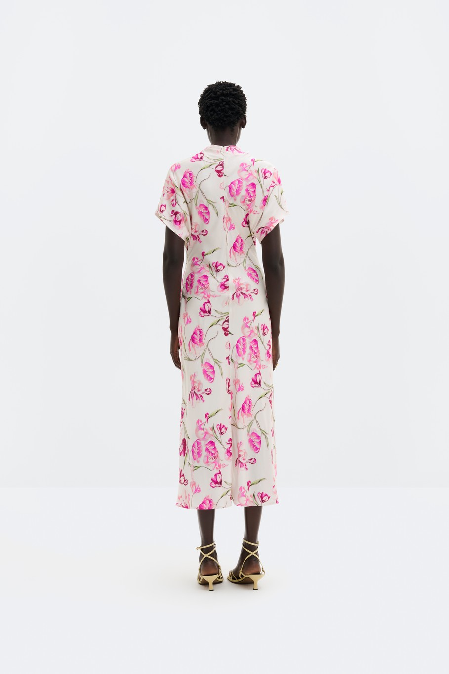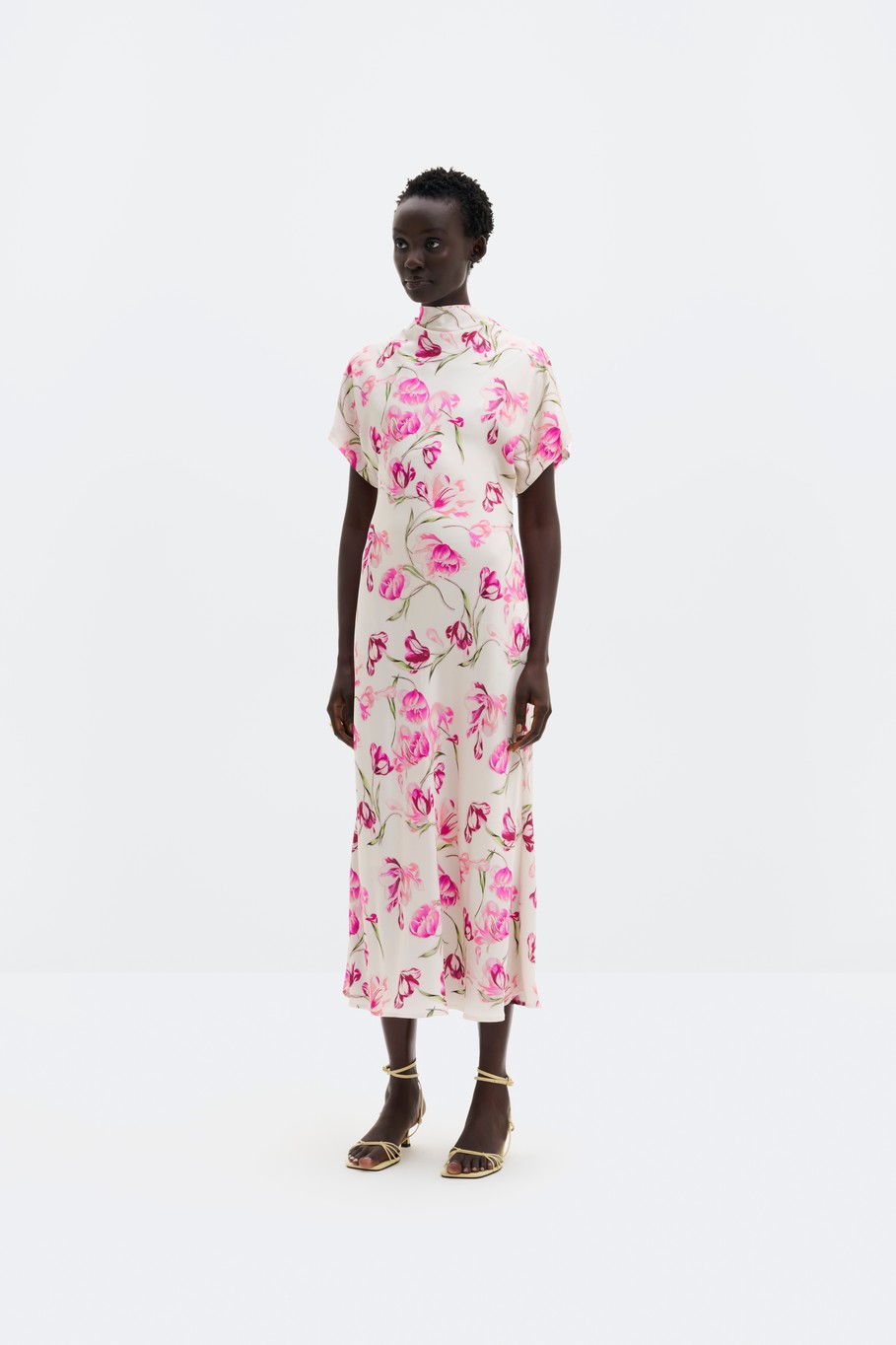 Super tyylikäs lyhythihallinen satiinimekko, jossa midi -mittainen helma ja laskostettu poolokaulus. Mekko on kauniisti muotoon ommeltu, joten suosittelemme valitsemaa oman koon ja koon isomman väliltä.