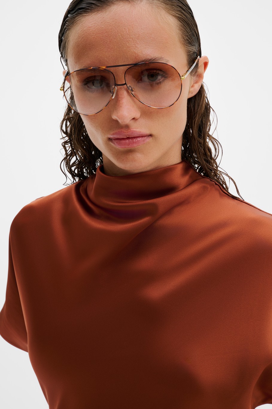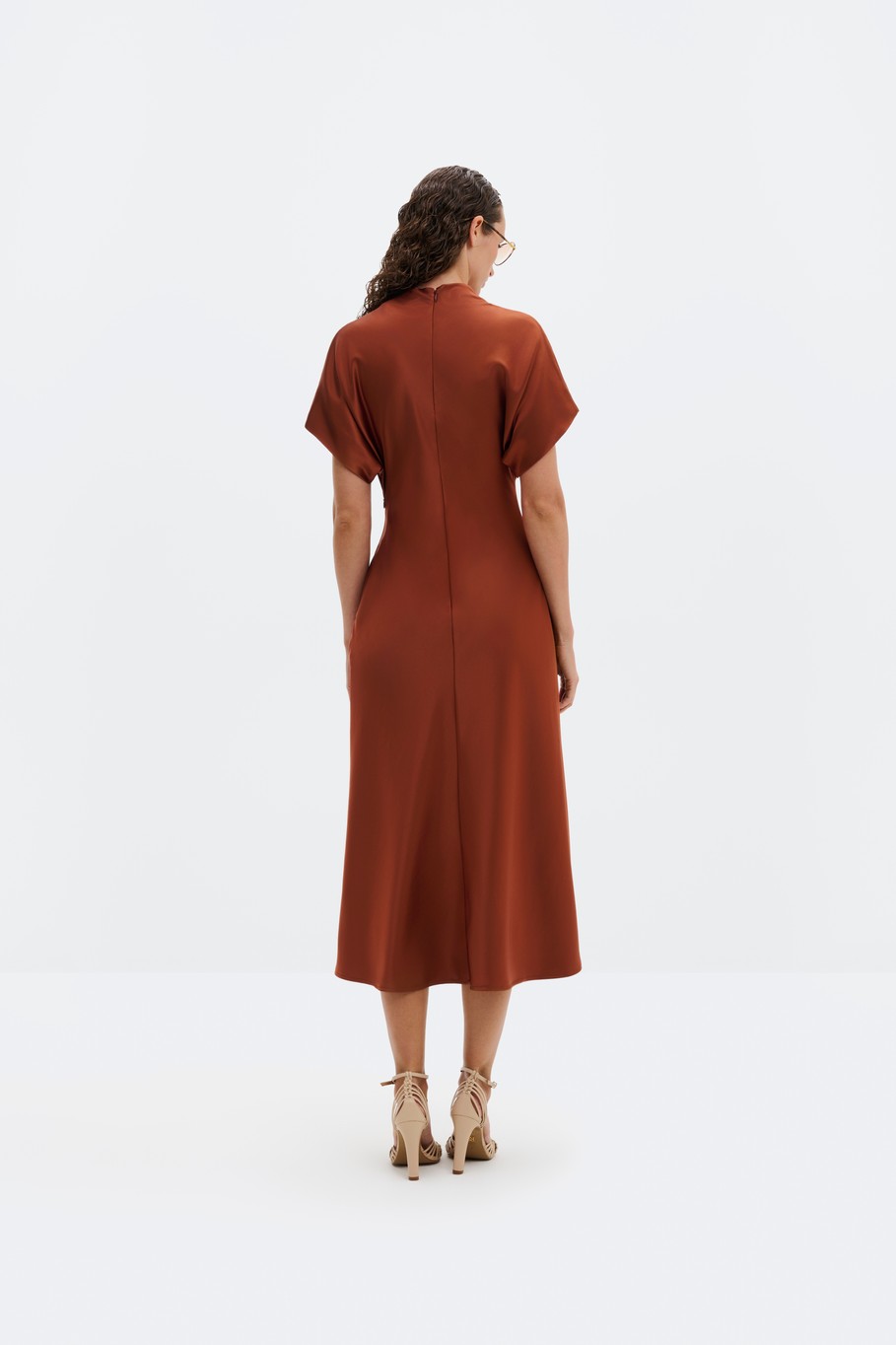 Super tyylikäs lyhythihallinen satiinimekko, jossa midi -mittainen helma ja laskostettu poolokaulus. Mekko on kauniisti muotoon ommeltu, joten suosittelemme valitsemaa oman koon ja koon isomman väliltä.