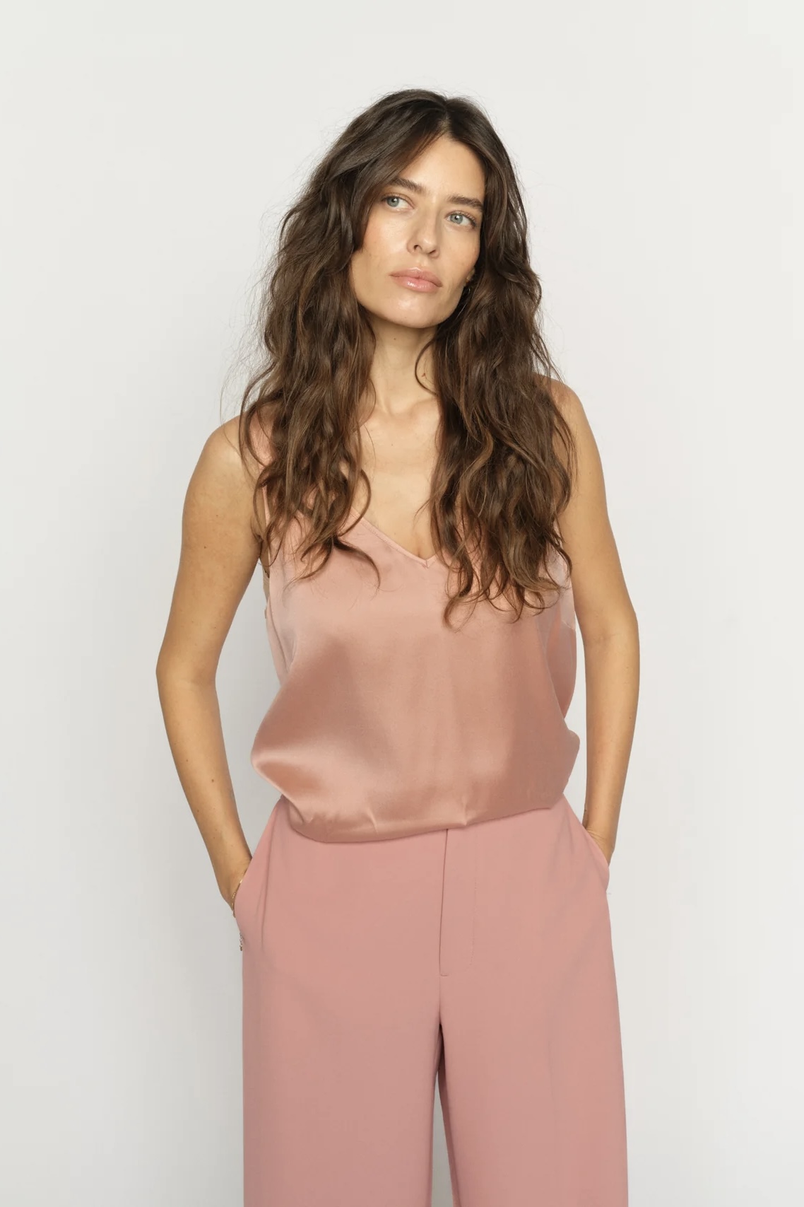 Super tyylikäs ja klassinen toppi on valmistettu kiiltävästä silkki sekoituksesta. Topissa imarteleva syvä kaula-aukko, paksut olkaimet sekä suora eleganttinen leikkaus. Silkki toppi sopii täydellisesti yhdistettynä Leyla Miley housujen ja Junie Miley bleiserin kanssa tai sitten rennosti lempi farkkujesi kanssa. Suosittelemme valitsemaan oman koon ja koon isomman väliltä.