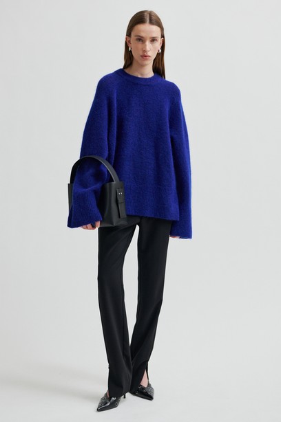 Klassinen ja pehmeä neulepusero, jossa yksityiskohtana pyöreä paksu kaulus, raglan -hiha ja helmassa pienet halkiot. Neuleessa rento malli ja koko, joten suosittelemme valitsemaan oman koon tai koon pienemmän.