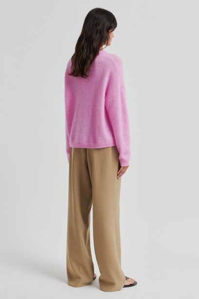 Klassinen mohair-villa sekoitteesta valmistettu neulepusero, jossa pyöreä pääntie, tiputetut olka päät ja rento istuvuus. Täydellinen neule vaaleiden farkkujen että hameiden kanssa. Suosittelemme valitsemaan oman koon ja koon pienemmän väliltä.