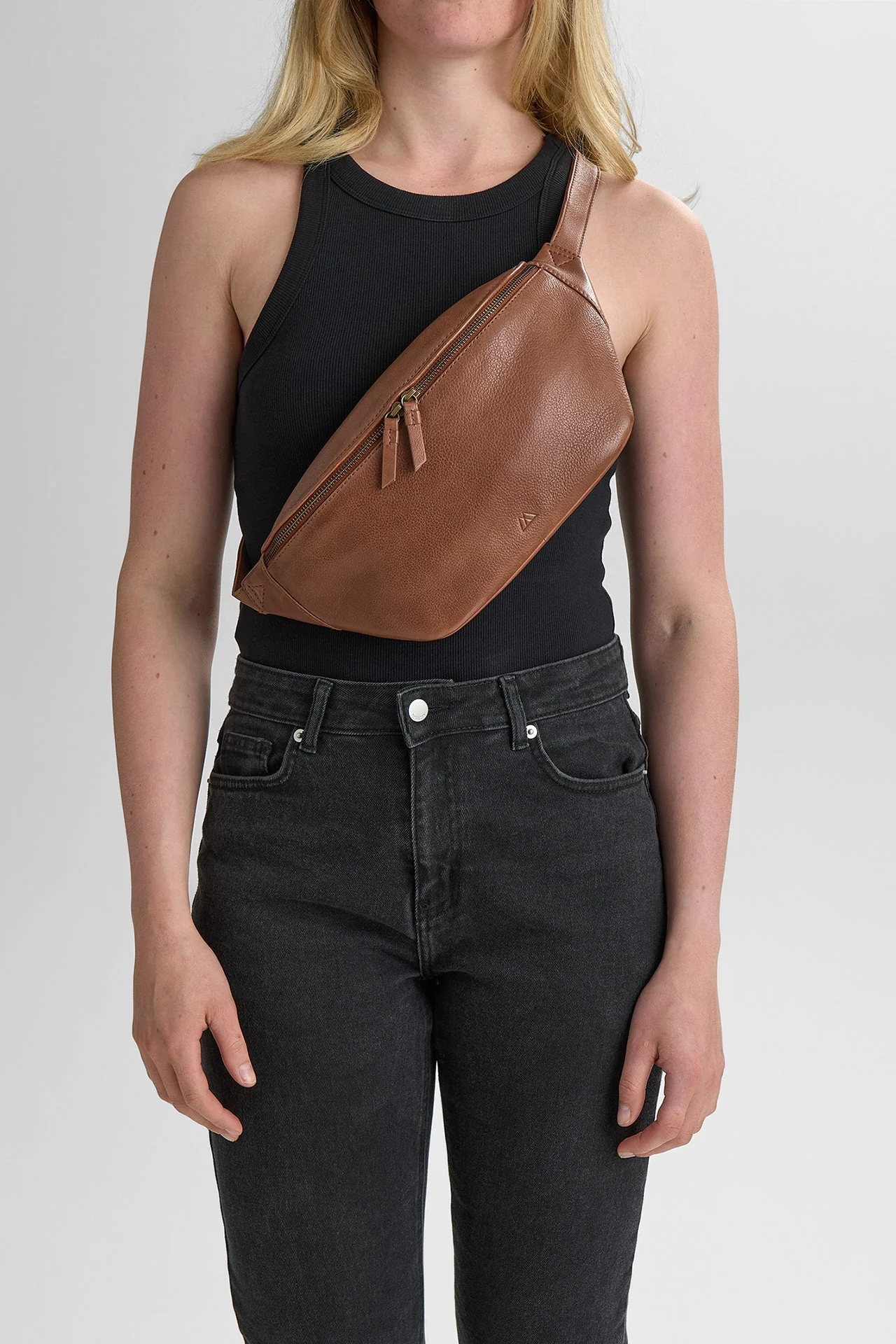 Klassinen ja siisti vyölaukku on valmistettu pehmeästä kierrätetystä nahasta. Vyölaukussa kultaiset vetoketjut sekä vetoketjulliset taskut sisäpuolella ja takana. Säädettävä pitkä hihna, joten voit pitää vyölaukkua myös olan yli.