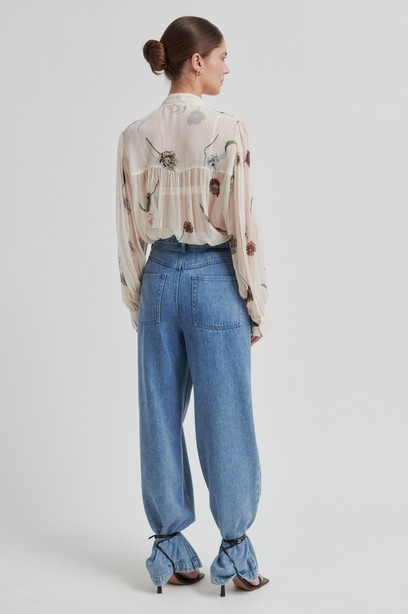 Kaunis kukkakuviollinen pusero on valmistettu ilmavasta viskoosista. Puserossa pyöreä kaulus, jossa on nappikiinnitys edessä, rennot hihat napillisilla hihansuilla. Väljä ja ilmava istuvuus, joten suosittelemme valitsemaan oman koon.