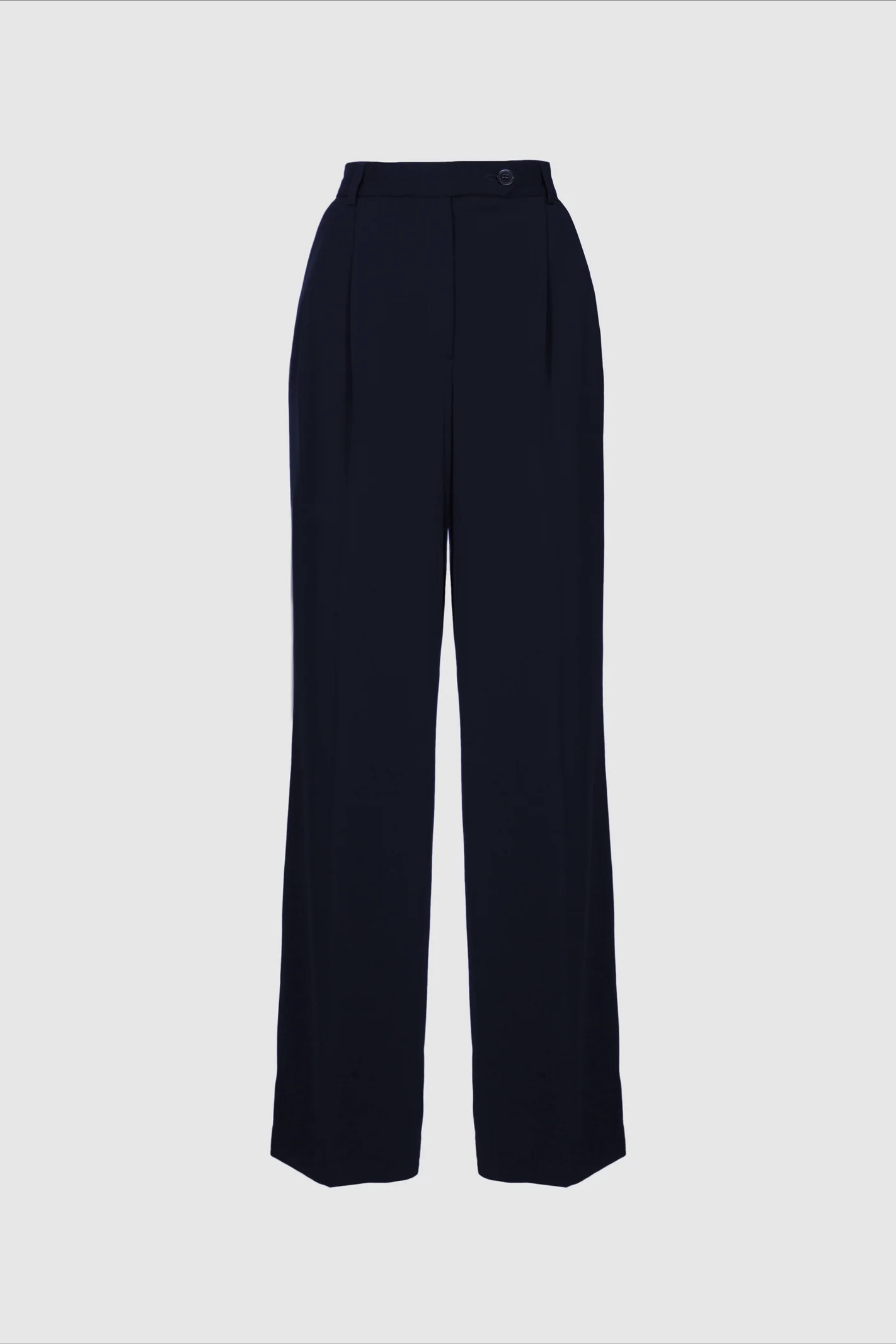 Täyspitkät ja leveät housut. Korkea vyötärö, vyölenkit, sivutaskut, ja vetoketju- sekä nappikiinnitys. Lahkeissa prässit edessä sekä takana. Suosittelemme valitsemaan oman koon ja koon isomman väliltä. Lahkeet ovat pitkät, joten suosittelemme tarvittaessa käyttämään lahkeet lyhennytyksessä.