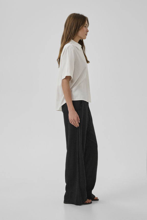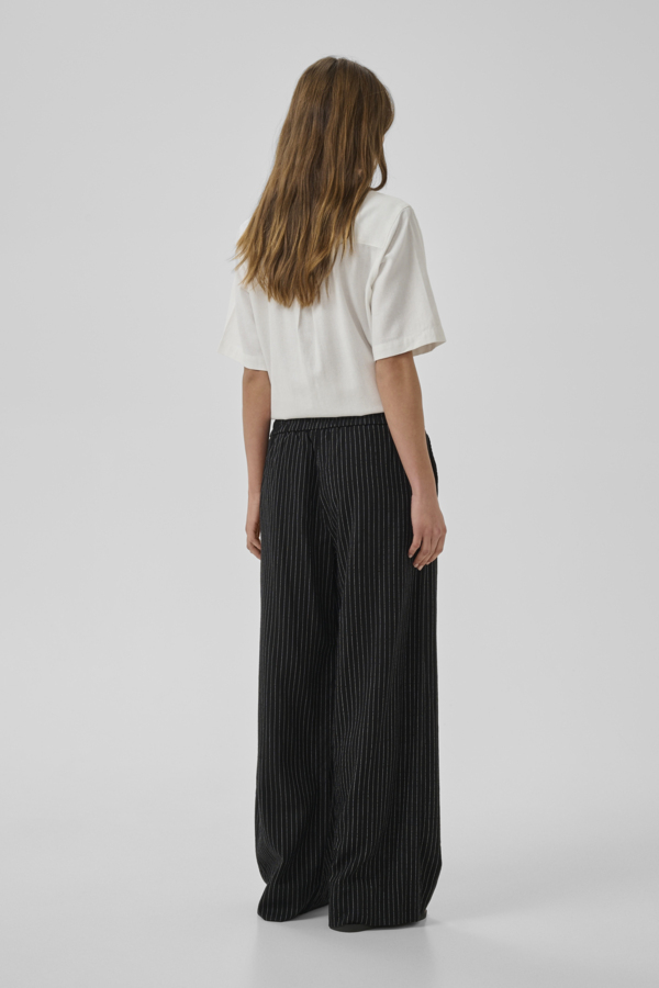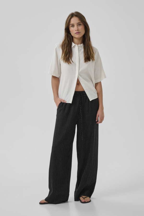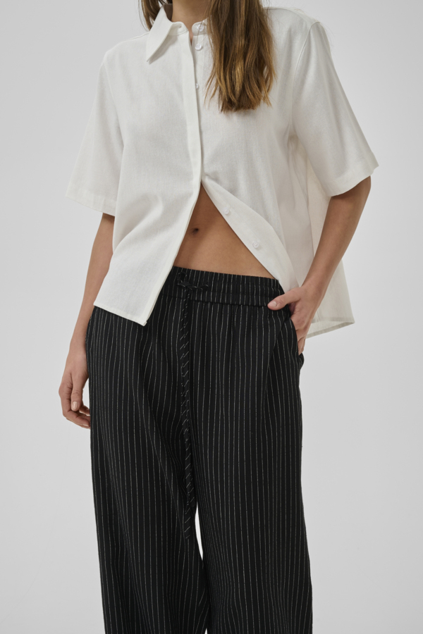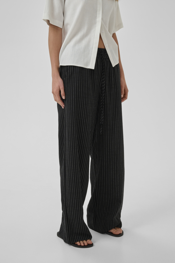 Jannie-housut ovat kesägarderobin varma best seller – kevyet, hengittävät ja visuaalisesti viimeistellyt. Musta pohja yhdistettynä ohuisiin valkoisiin pystyraitoihin tuo siluettiin pituutta ja luo elegantin, ajattoman ilmeen, joka toimii sesongista toiseen.