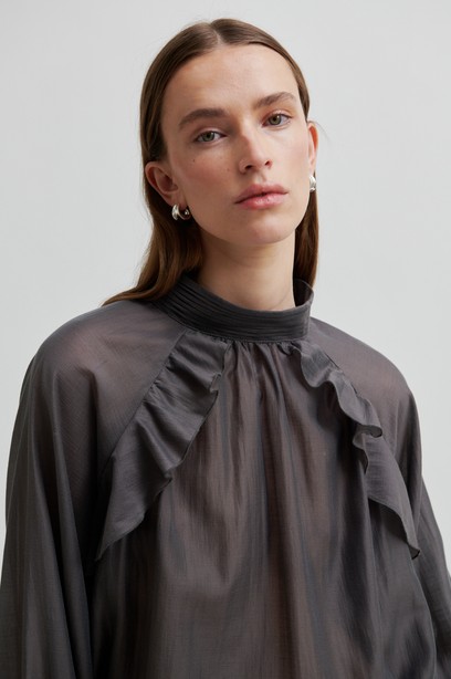 Kaunis röyhelöpusero on valmistettu ohuesta lyocell sekotteesta. Puserossa yksityiskohtana korkea kaulus, rinnuksella röyhelöt sekä volyymiset hihat. Normaali malli ja koko.