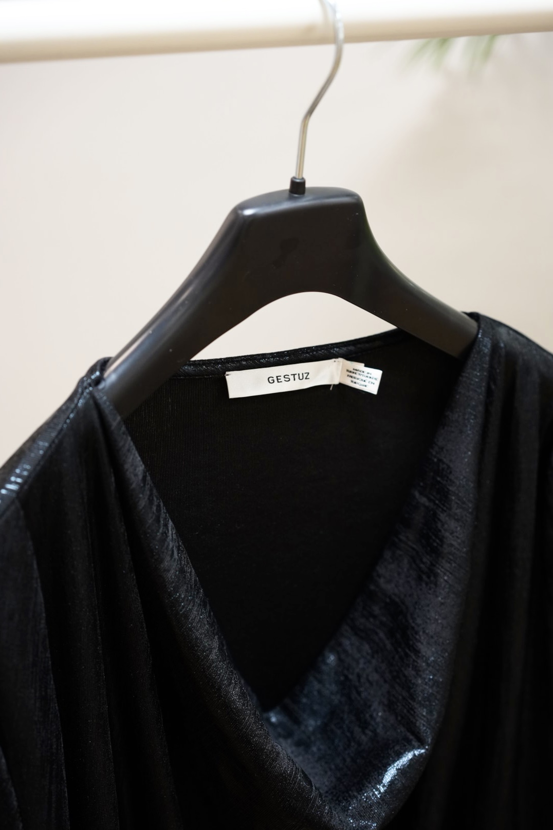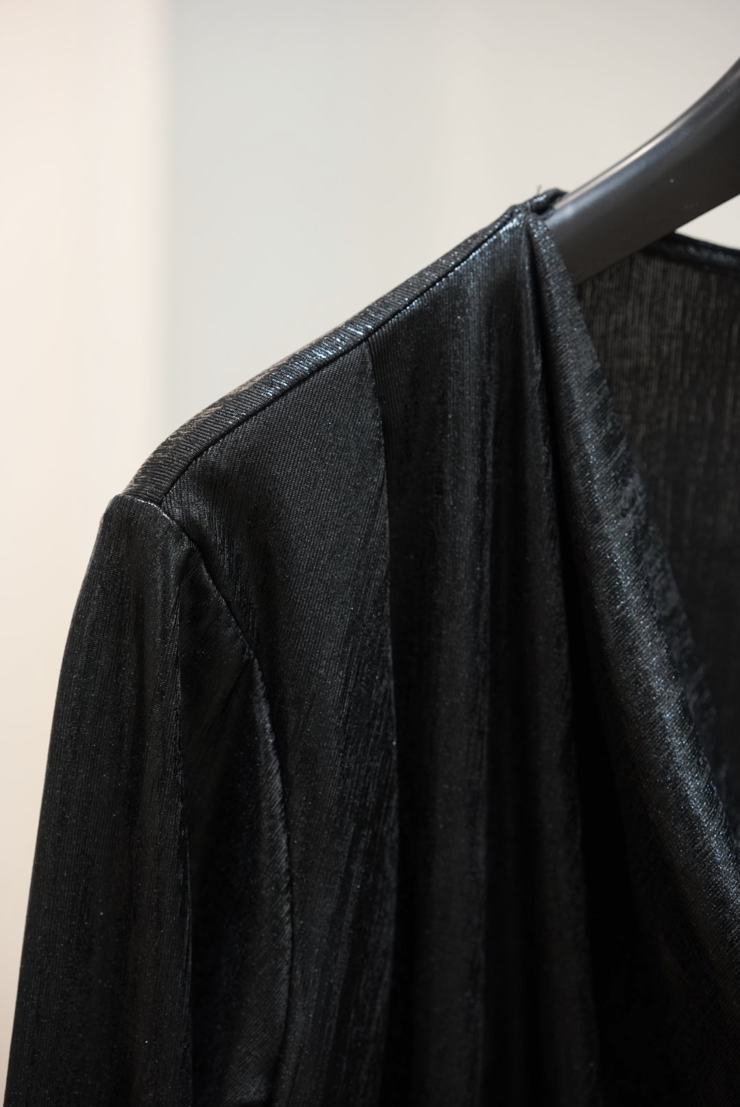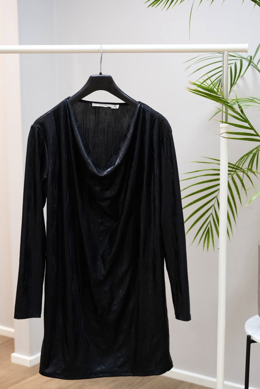 Kaunis lyhyt mekko vesiputous kauluksella. Kiiltävä kangas. Värinä tummanharmaa/musta.