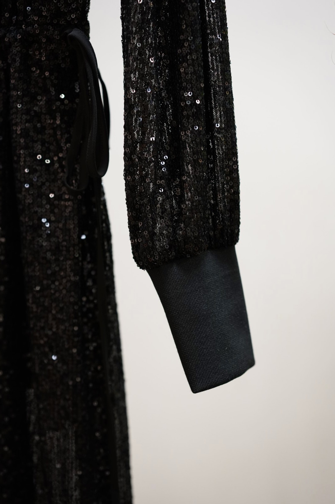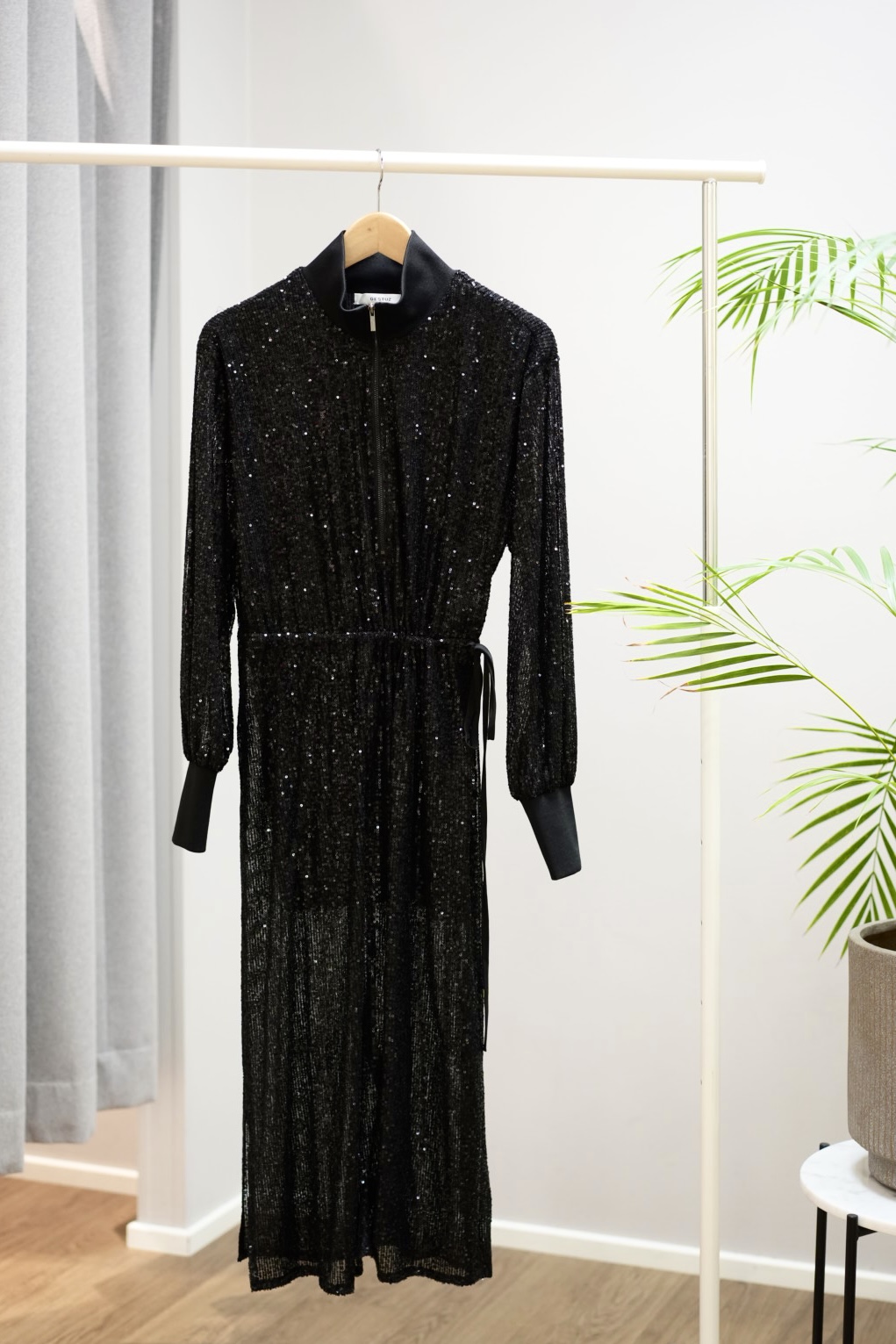 Upea musta paljettimekko, jossa vyötäröllä kiristys ja alumekko hieman lyhempi paljetti helmaa. Resorit hihoissa ja korkea kaulus vetoketjulla. Upea mekko kerrassaan.