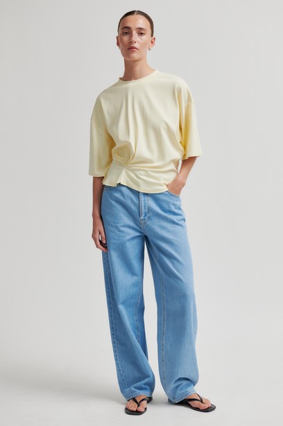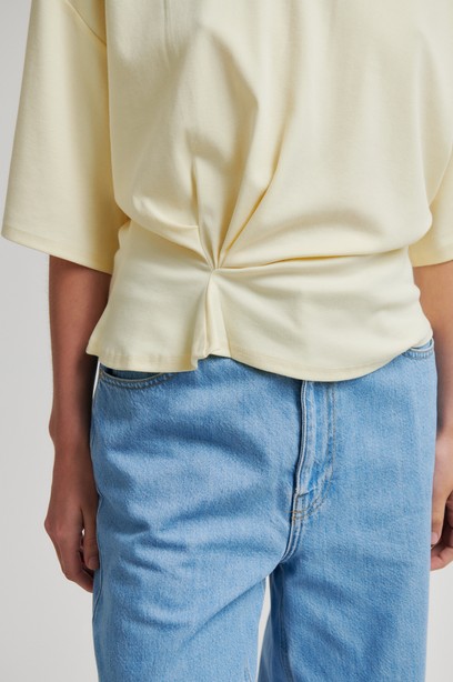 Tyylikäs ja rento t-paita on valmistettu pehmeästä lyocell-puuvilla sekoitteesta. T-paidassa yksityiskohtana vyötäröllä rypytys, pyöreä pääntie sekä rennto 3/4 -osa hihat. T-paidassa ylhäältä rento istuvuus ja vyötäröltä istutettu. Suosittelemme valitsemaan oman koon.