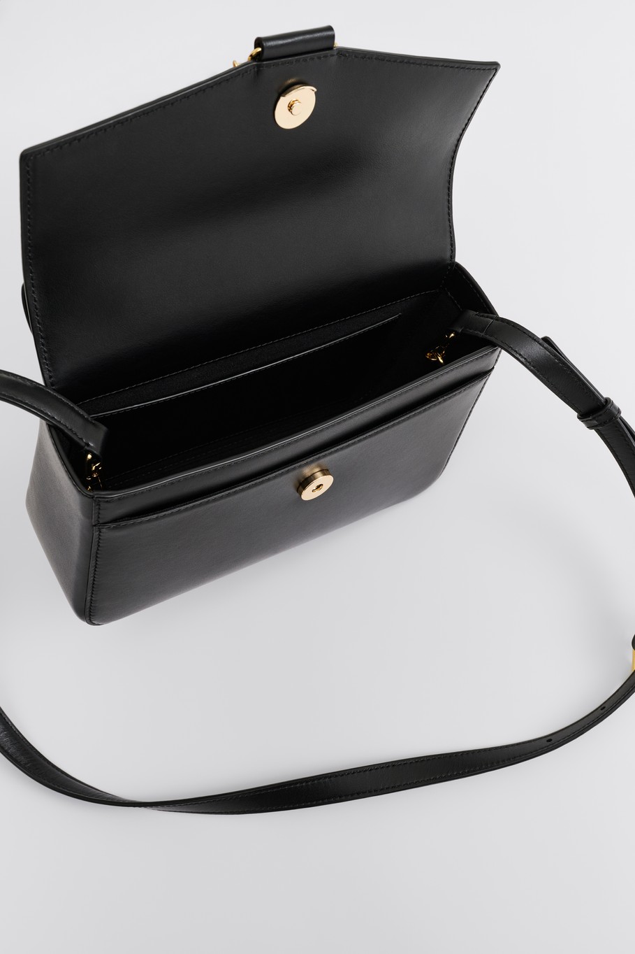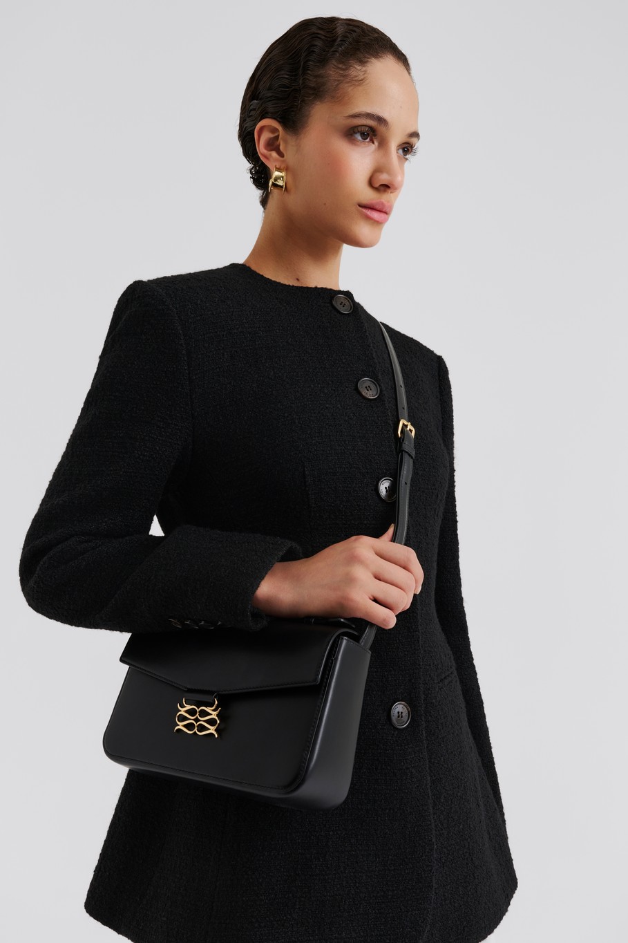 Sileästä italialaisesta nahasta valmistettu olkalaukku, jossa on läppä ja Malina Monogram -koristeet. Olkalaukussa on kantokahva sekä irrotettava ja säädettävä hihna.