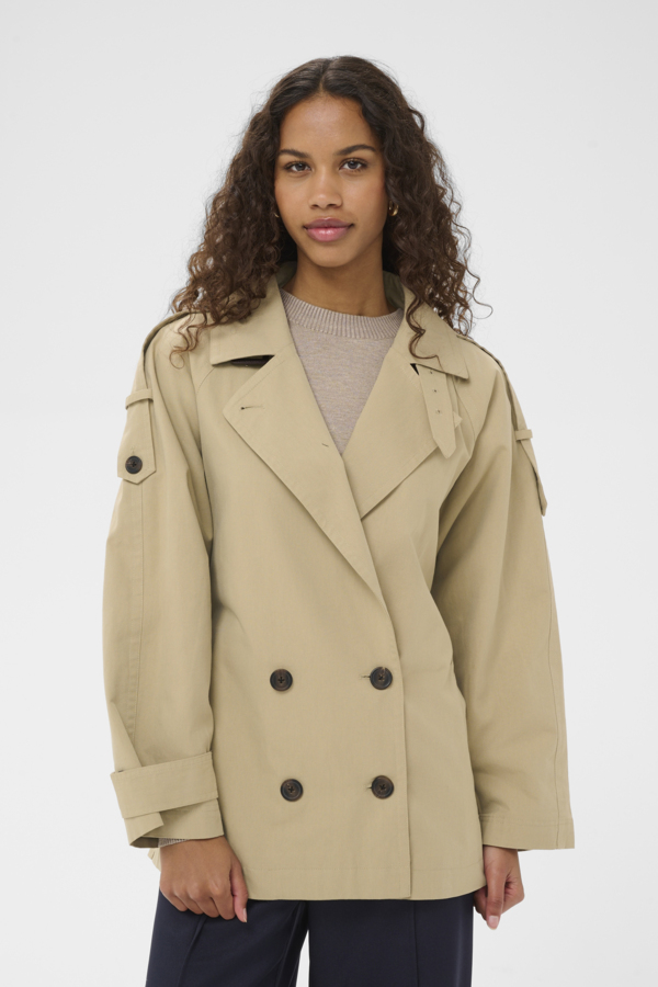Rento ja tyylikäs trenssitakki kahdella nappirivityksellä. Takissa leveät kaulukset, jotka saat napitettua kiinni, irrotettava vyö vyötäröllä sekä nappi yksityiskohdat olkapäissä. Rento ja laatikkomainen malli, joten suosittelemme valitsemaan oman koon ja koon pienemmän väliltä.