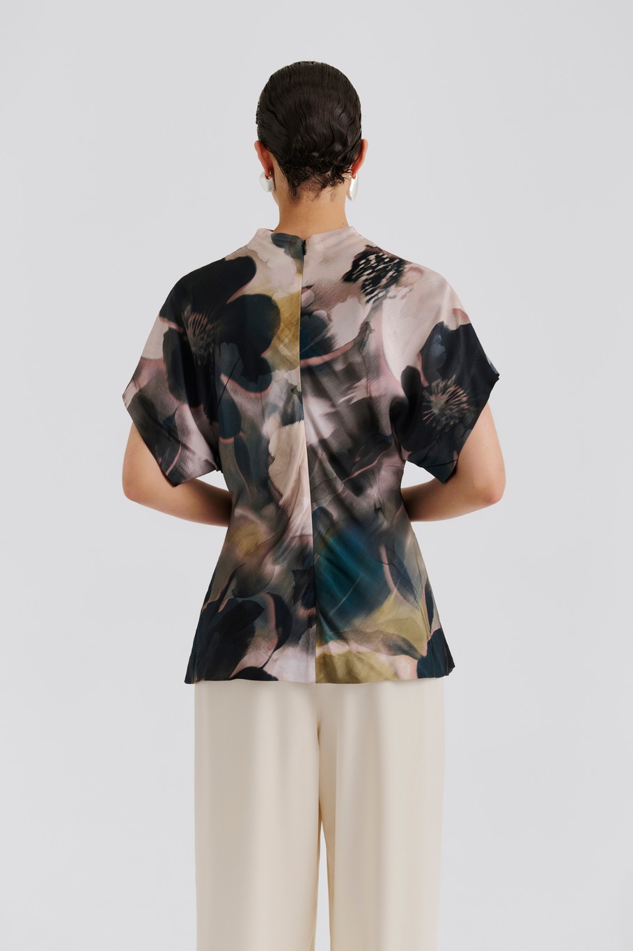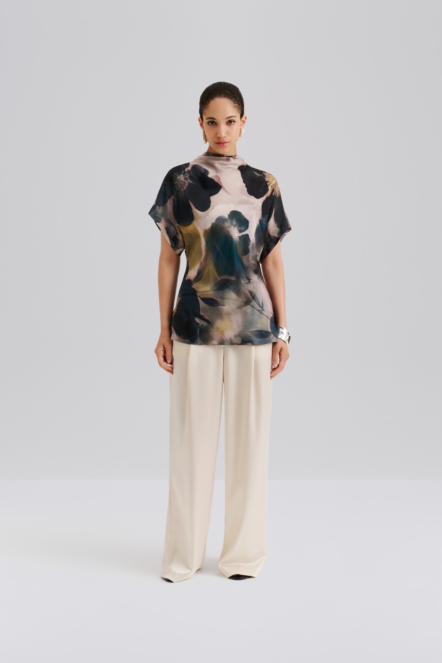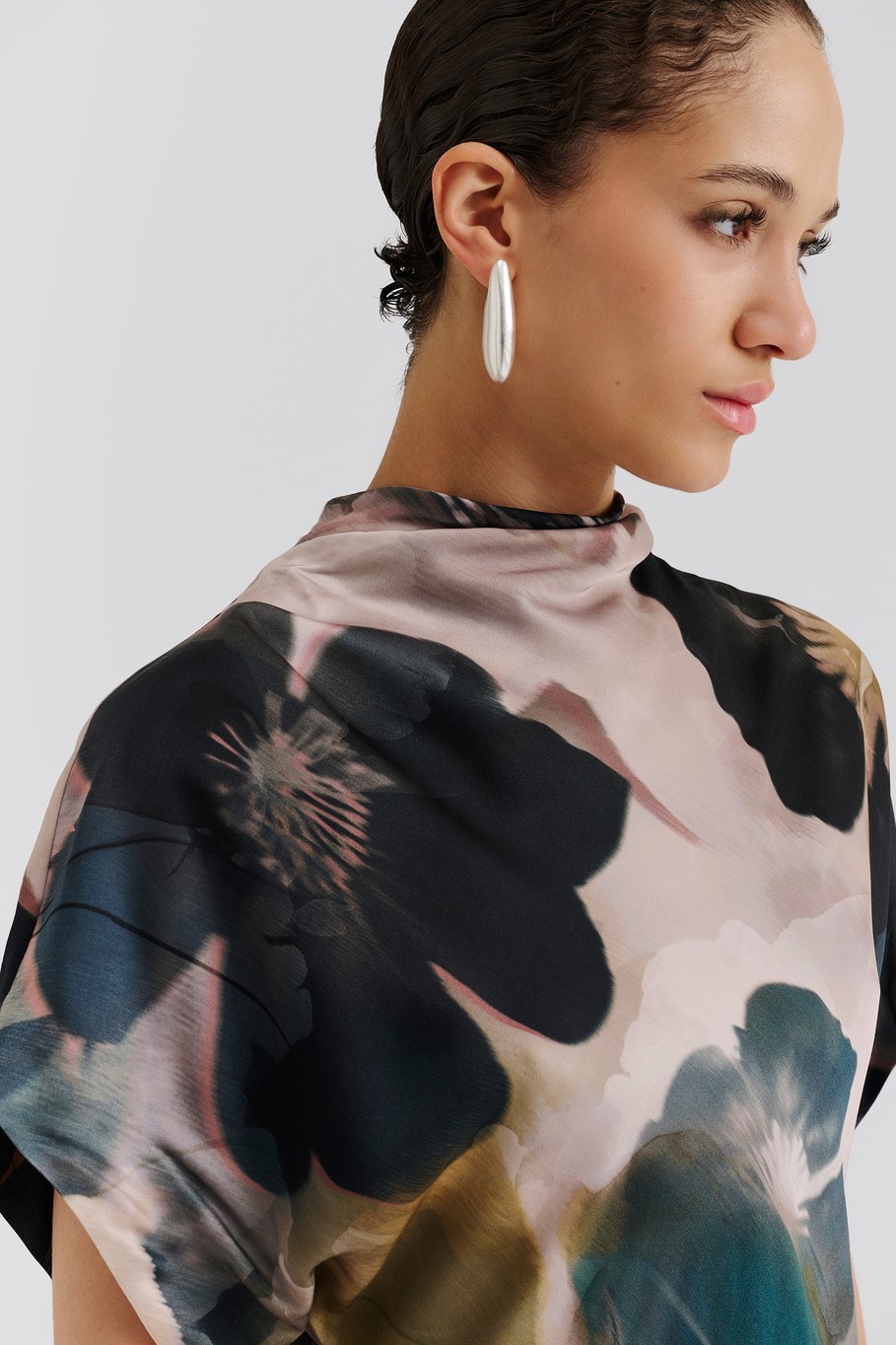 Kaunis ja ilmava satiinitoppi, jossa puoli poolokaulus draped -efektillä sekä muotoiltu siluetti. Suosittelemme valitsemaan oman koon.