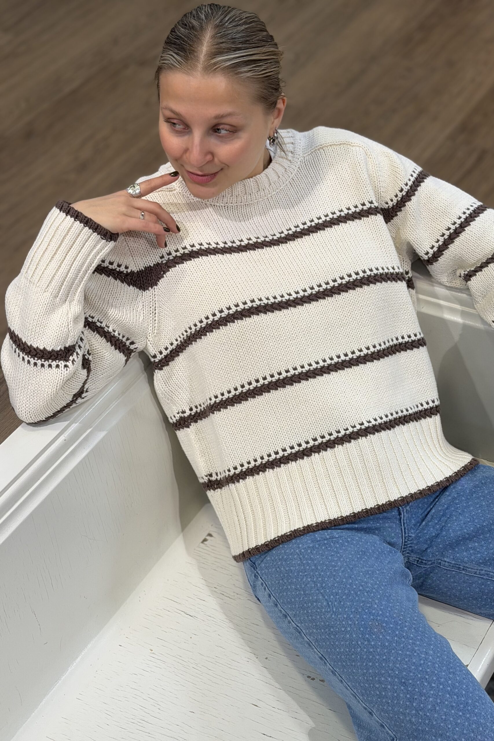 Super suosittu, rento neulepusero on valmistettu pehmeästä puuvillasta. Neuleessa pyöreä kaula-aukko, raglan -hihat sekä yksityiskohtana kaunis kohokuvioitu raita sekä kultainen Mos Mosh -merkki. Neuleessa rento istuvuus, joten suosittelemme valitsemaan oman koon