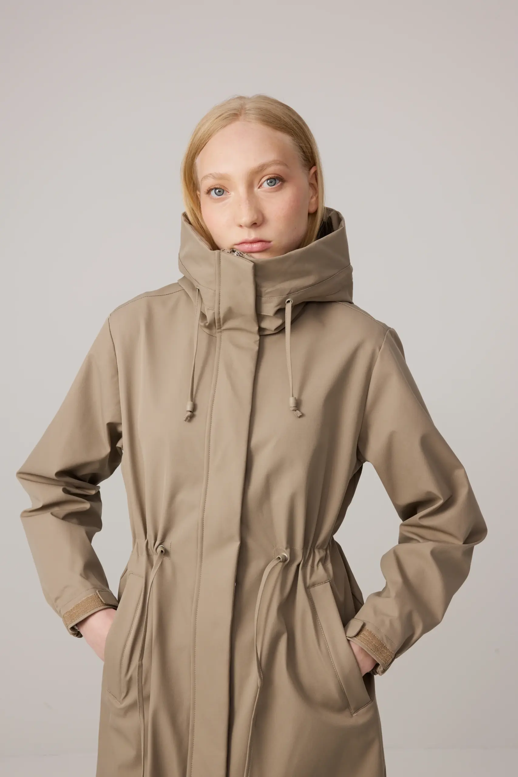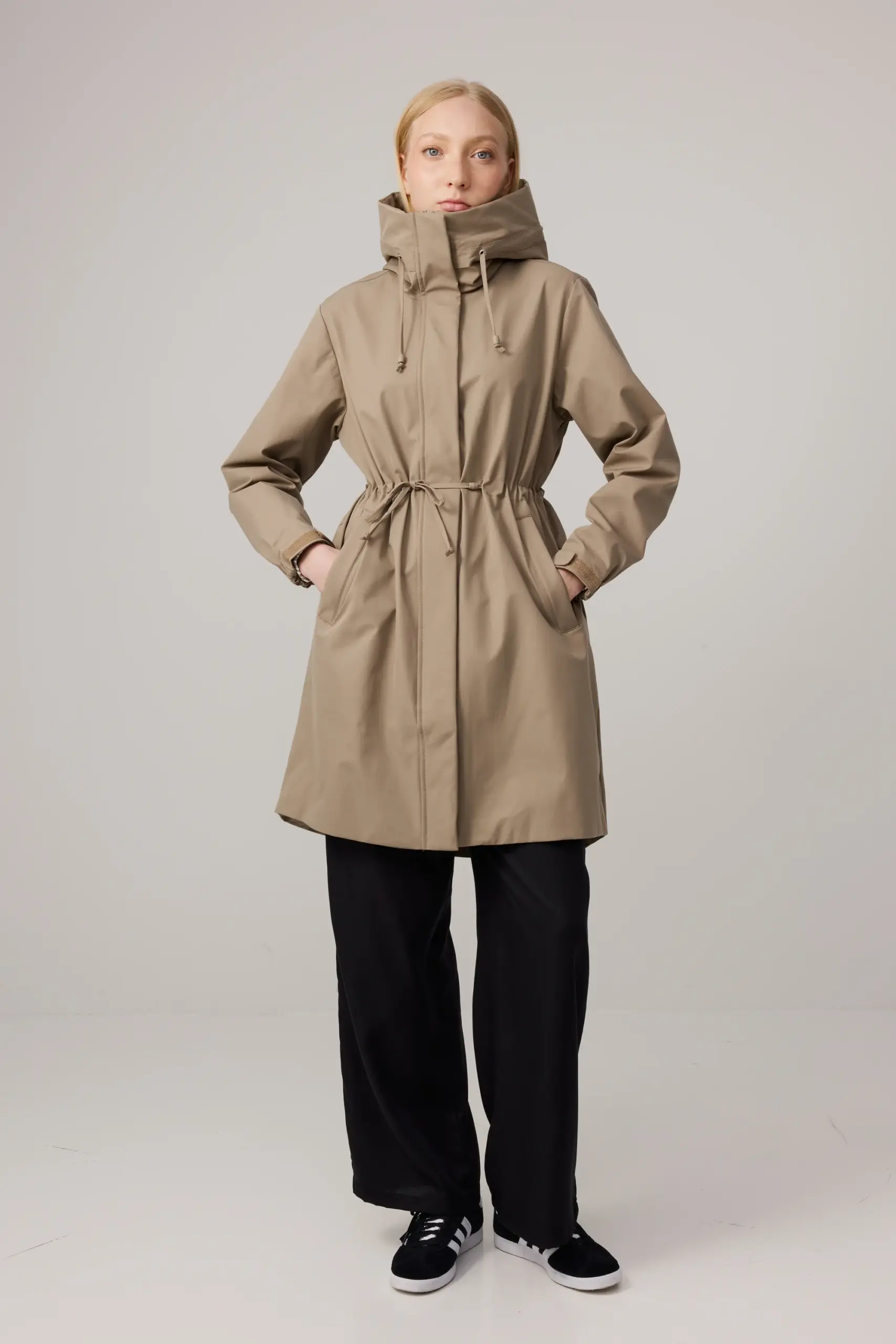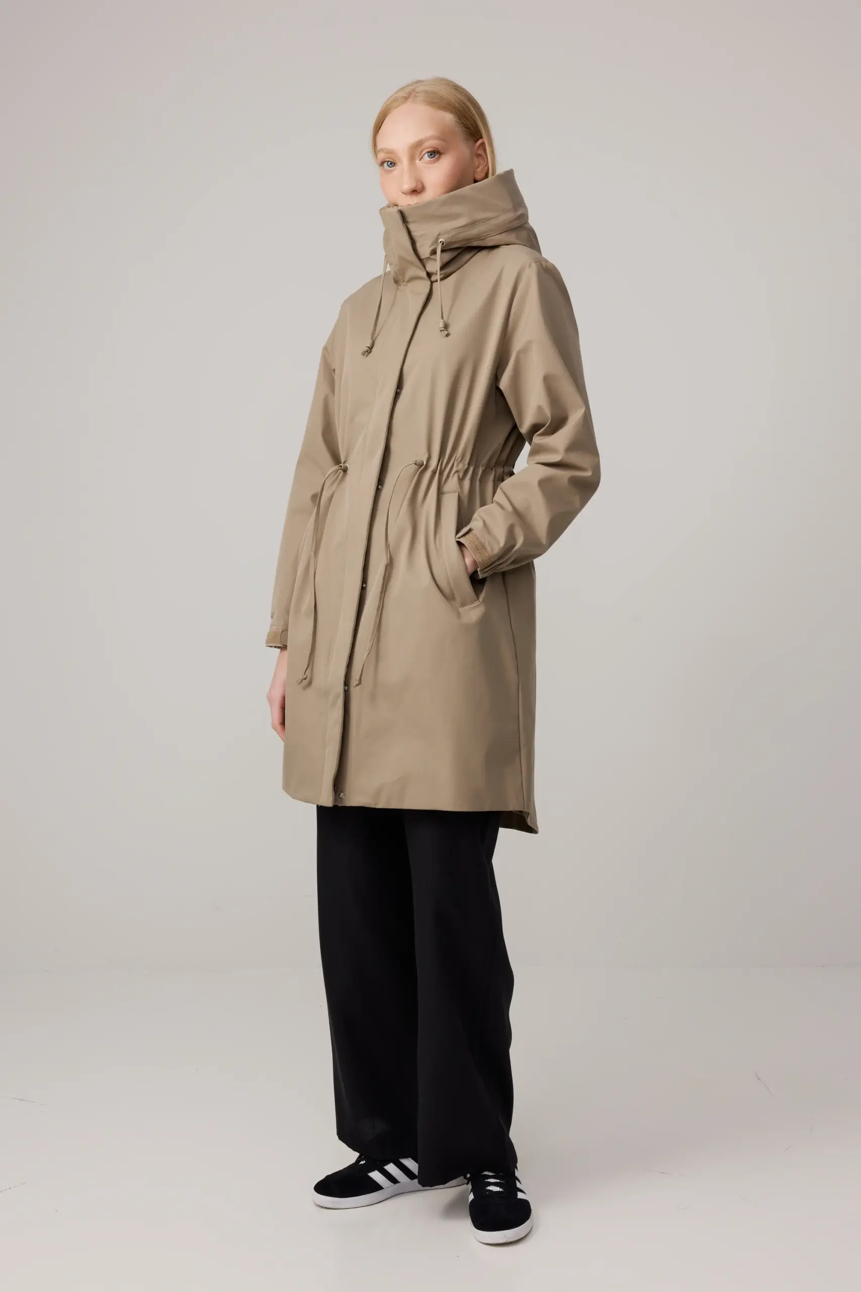 Tyylikäs takki, joka on suunniteltu jokapäiväiseen käyttöön. Rylie -takissa on säädettävät kiristysnyörit vyötäröllä, joiden avulla istuvuutta ja siluettia voi mukauttaa, keskipitkä pituus sekä veden kestävä pintamateriaali. Täydellinen takki siis säällä kuin säällä! Rento malli ja koko, joten suosittelemme valitsemaan oman koon tai koon pienemmän väliltä.