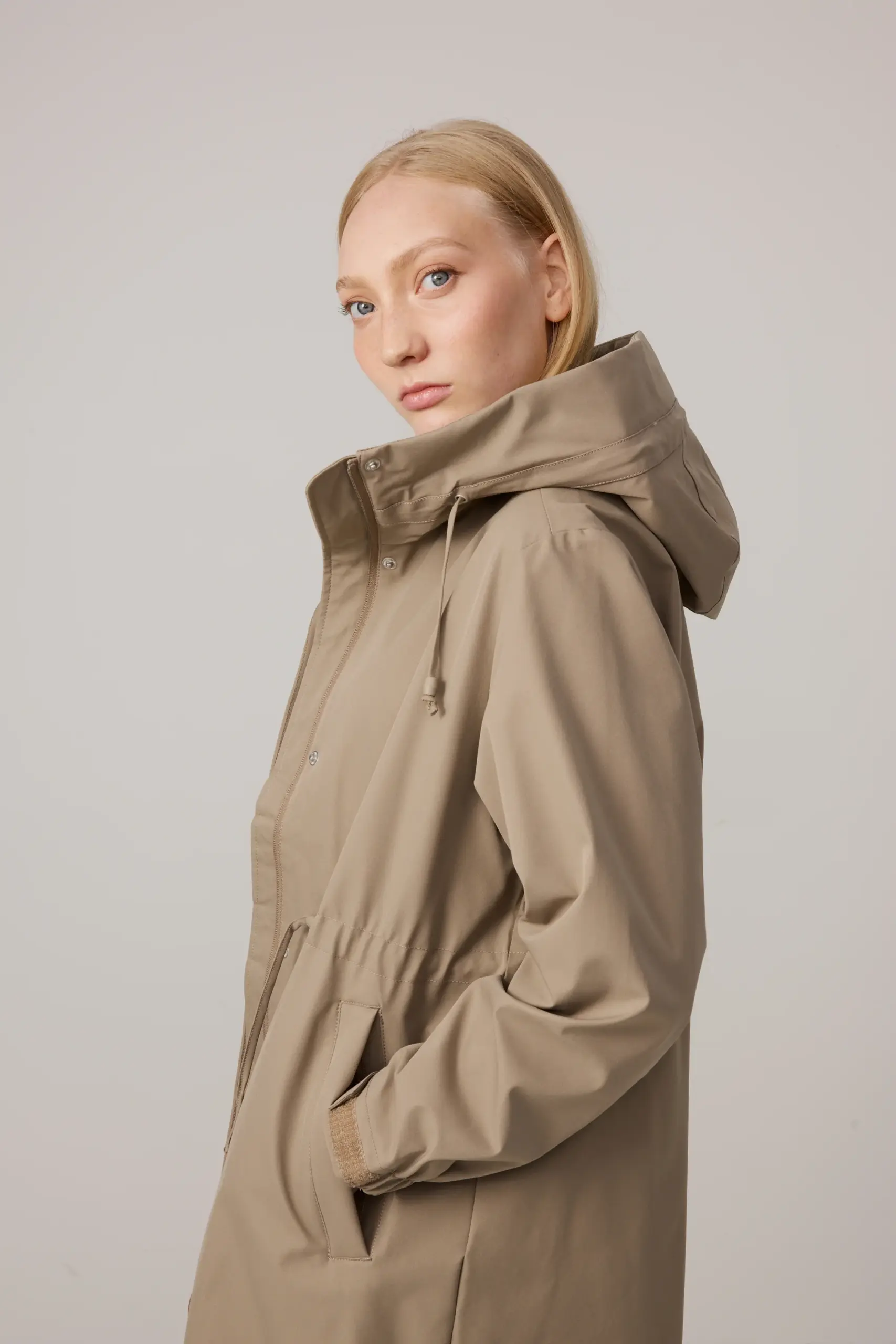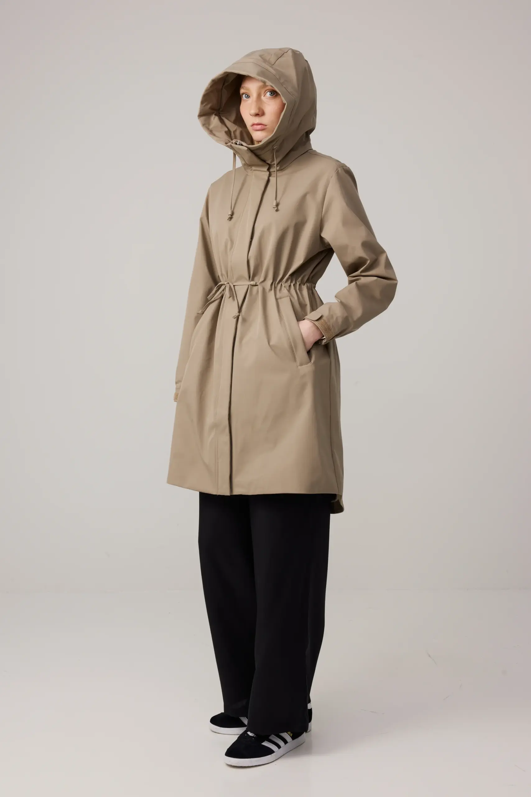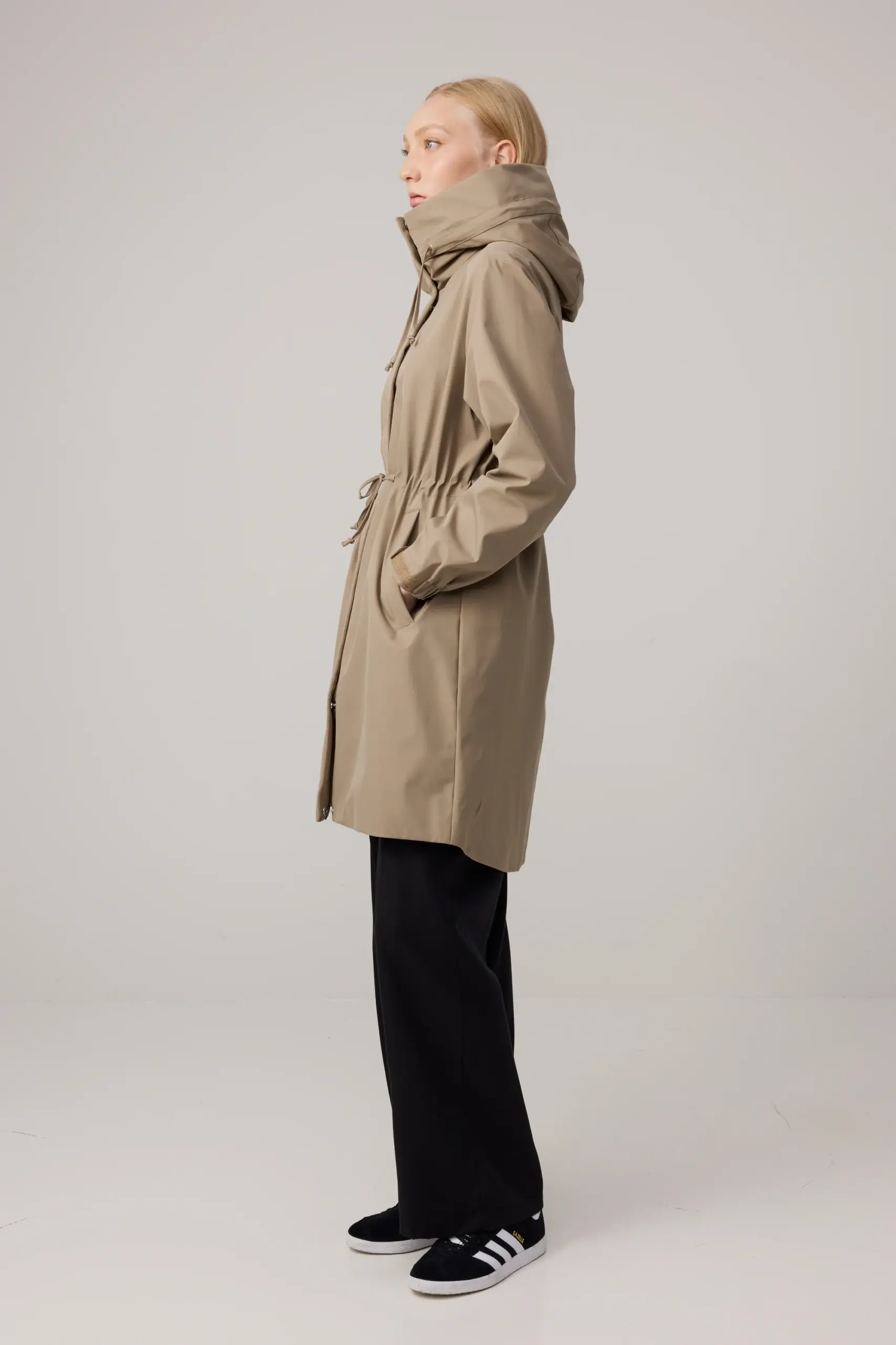Tyylikäs takki, joka on suunniteltu jokapäiväiseen käyttöön. Rylie -takissa on säädettävät kiristysnyörit vyötäröllä, joiden avulla istuvuutta ja siluettia voi mukauttaa, keskipitkä pituus sekä veden kestävä pintamateriaali. Täydellinen takki siis säällä kuin säällä! Rento malli ja koko, joten suosittelemme valitsemaan oman koon tai koon pienemmän väliltä.