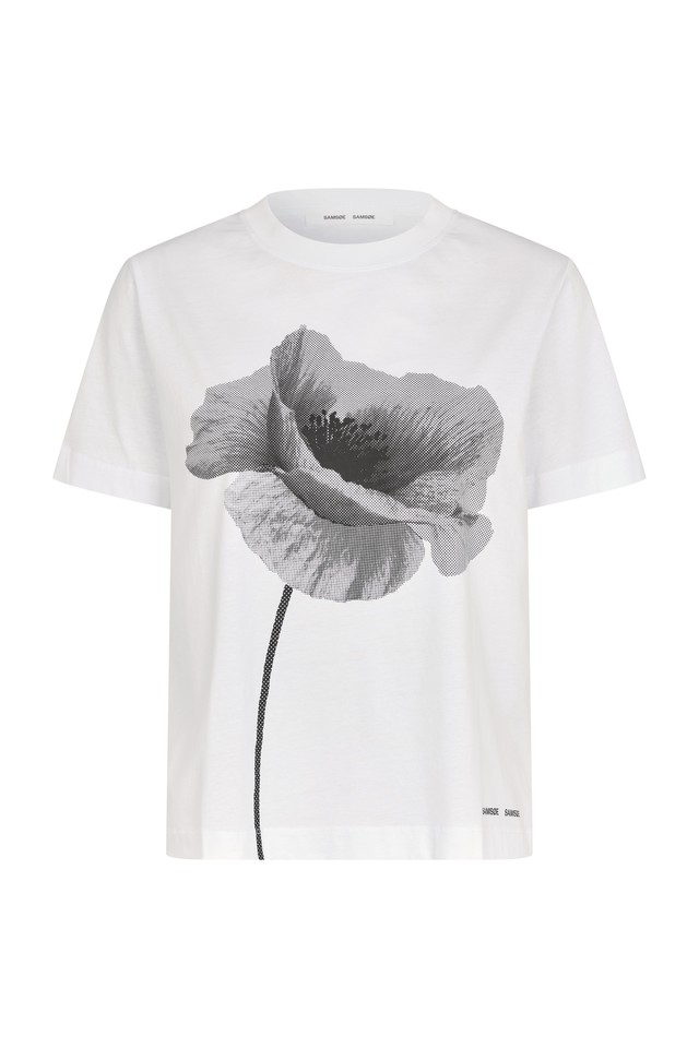 Kaunis ja rento puuvillasta valmistettu t-paita, jossa yksityiskohtana rinnuksella iso kuva sekä Samsoe Samsoe – teksti. Normaalia kokoa, joten suosittelemme valitsemaan oman koon.