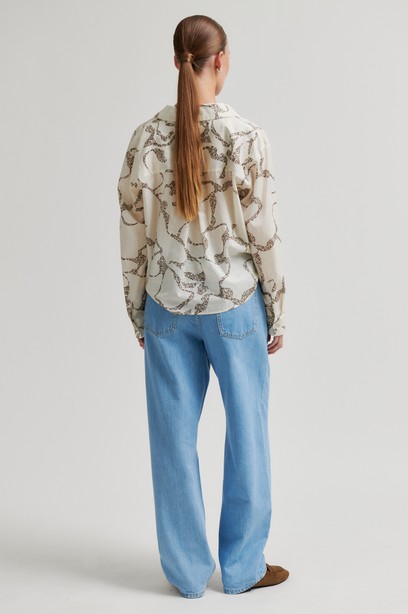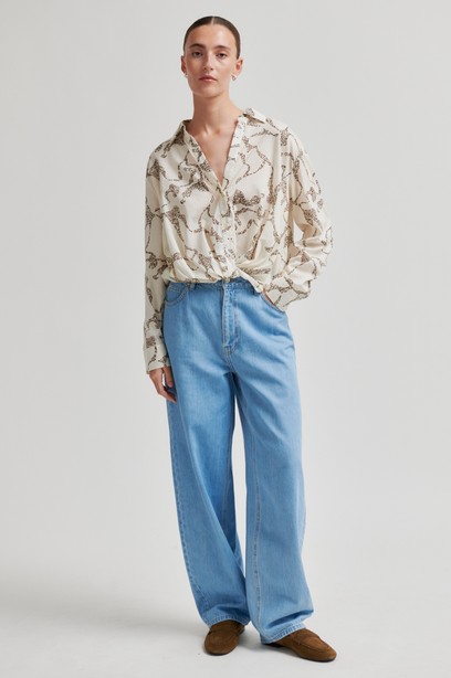 Tyylikäs kuviollinen pusero, joka on valmistettu pehmeästä ja hieman läpikuultavasta puuvillasta. Pusserossa solmittu helma, skarpit kaulukset sekä syvä imarteleva kaula-aukko. Rento malli ja koko, joten suosittelemme valitsemaan oman koon tai koon pienemmän.