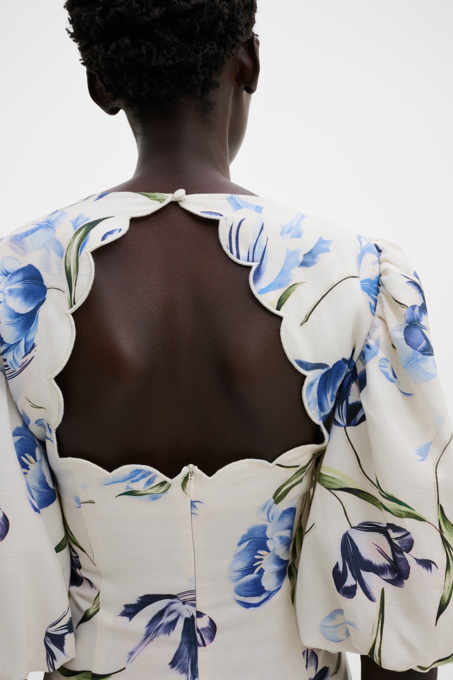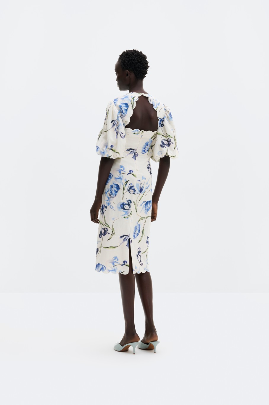 Super kaunis kotelomekko on valmistettu pehmeästä pellava viskoosi sekoitteesta. Mekossa lyhyet ja puffatut hihat, avoin selkä sekä midi -mittainen helma. Mekossa suora leikkaus, joten suosittelemme valitsemaan oman koon ja koon isomman väliltä.