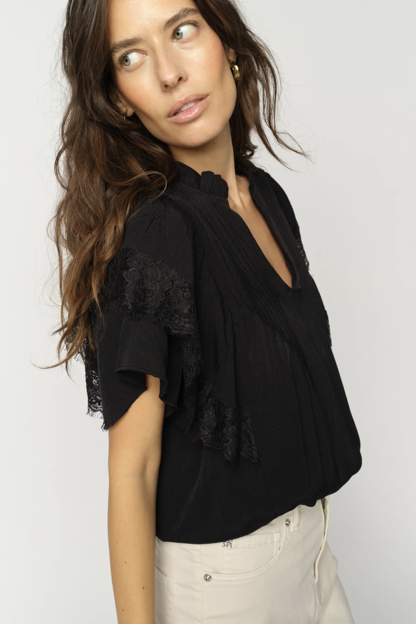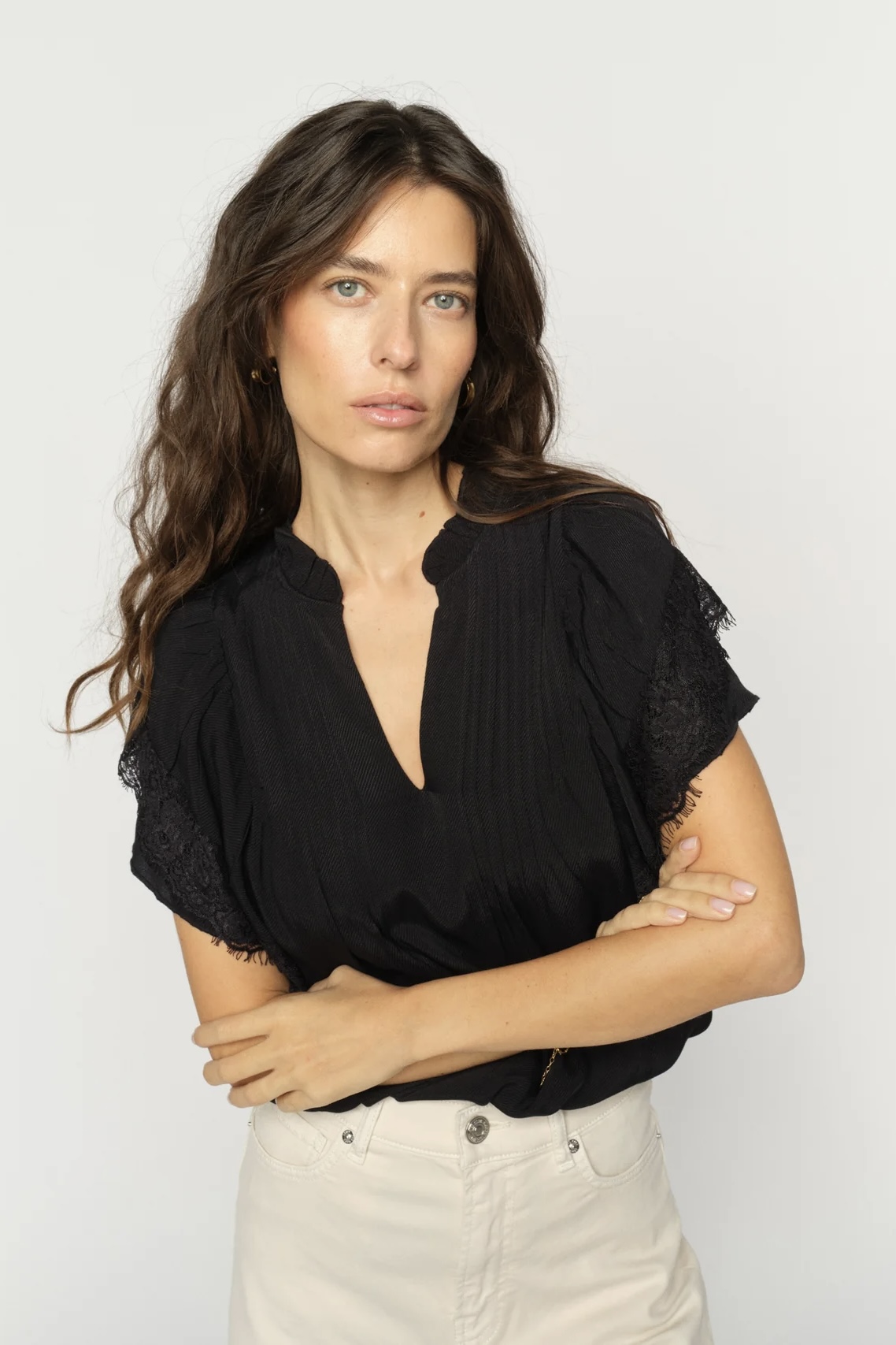 Kaunis lyhyt hihallinen pusero on valmistettu ilmavasta viskoosista. Yksityiskohtana puserossa imarteleva V- kaula-aukko, kevyet laskokset sekä frillat hihoissa. Puserossa normaali istuvuus ja koko, joten suosittelemme valitsemaan oman koon.