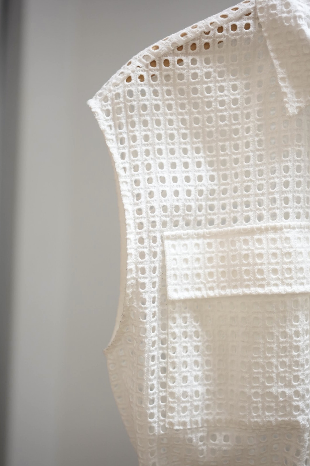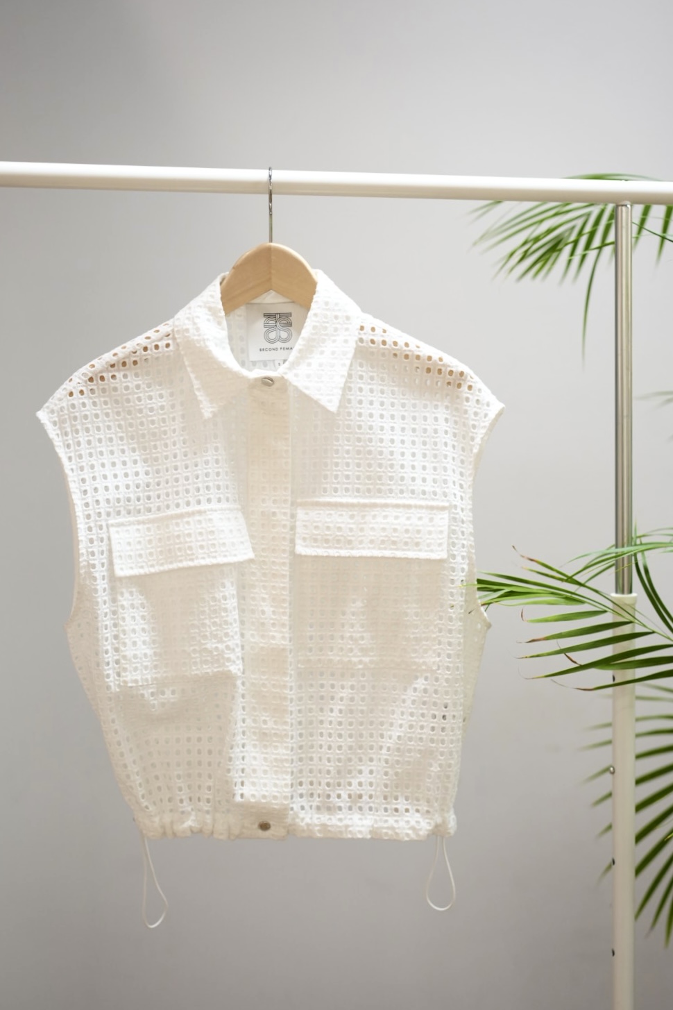 Ihana valkoinen reikä liivi. Nappi kiinnitys ja kiristys alareunassa.